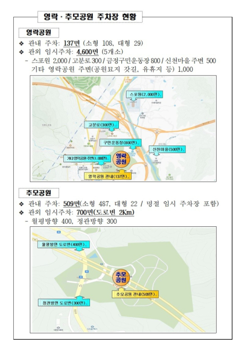 참배객 교통 편의를 위해 영락공원 인근 금정구민운동장, 스포원파크, 신천마을 일원 등에 총 4600면의 임시주차장을 마련하고, 추모공원 진입도로 양방향에는 약 700면의 임시주차 공간을 확보한다.
