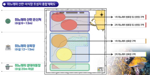 특히 인공구조물 시설과 서식 환경 개선을 통해 쥐노래미의 산란 및 서식에 적합한 환경을 조성하고, 기존 인공구조물과의 연계를 통해 연안 전반으로 자원 확산 효과를 유도할 계획이다. 또한 5년간 지속적인 쥐노래미 자원첨가와 효과조사를 병행하여 어업 생산성 향상을 도모할 예정이다.