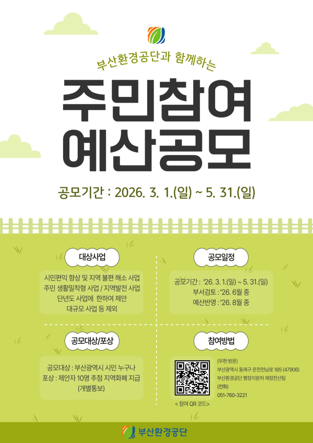부산환경공단(이사장 이근희)은 시민이 직접 예산 편성에 참여하는 ‘2026년 주민참여예산 제안사업’을 오는 3월 1일부터 5월 31일까지 3개월간 공모한다고 밝혔다.