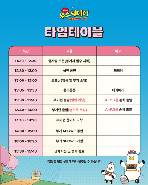 이번 행사는 부기와 시민이 함께하는 참여형 콘텐츠로, 슬로우조깅과 러닝 프로그램을 중심으로 체험·공연·마켓이 결합된 복합형 행사로 운영된다.