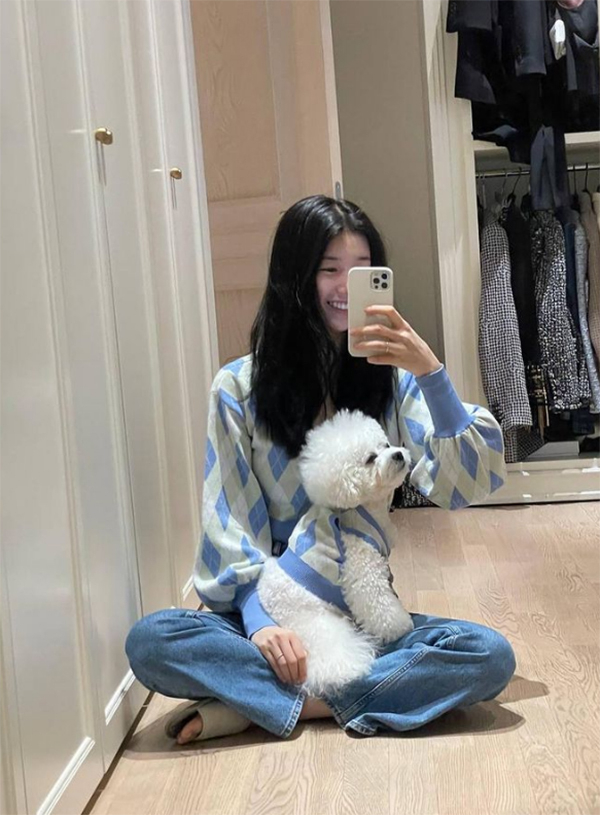 공개된 사진 속 수지와 데지는 하늘색 아가일 패턴의 니트를 커플룩으로 맞춰 입고 입고 다정하게 사진을 찍고 있다.