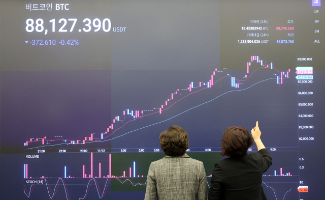 12일 비트코인이 미국 대선에서 도널드 트럼프 전 대통령의 당선에 힘입어 연일 사상 최고치를 기록하고 있다. 서울 강남구 업비트 라운지. 연합뉴스