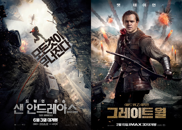 영화 '샌 안드레아스'와 '그레이트 월'이 케이블 영화채널을 통해 방영되며 누리꾼들의 눈길을 끌고 있다.