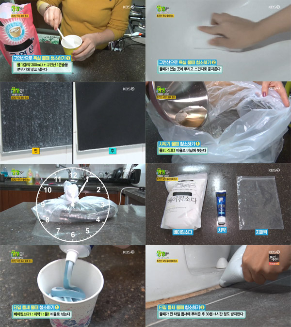 이날 소개된 '물때 청소법'으로는 구연산을 활용하는 것이다. 물 1컵 200ml에 구연산 1큰술을 분무기에 넣고 섞어 준 뒤, 욕실의 수도꼭지와 거울 등 물때가 있는 곳에 골고루 뿌려주고 스펀지로 그 부위를 문질러 주고 물때를 물로 헹궈내면 된다.
