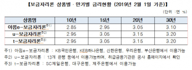 이에 따라 한국주택금융공사 홈페이지(www.hf.go.kr)를 통해 신청하는 ‘u-보금자리론’과 은행 창구에서 신청하는 ‘t-보금자리론’은 대출만기에 따라 연 2.95%(만기 10년)∼3.20%(30년)로 이용할 수 있다. 또 전자약정 등 온라인으로 신청해 비용이 절감되는 ‘아낌e-보금자리론’은 0.10%포인트 저렴한 연 2.85%(10년)∼3.10%(30년)의 금리가 적용된다.