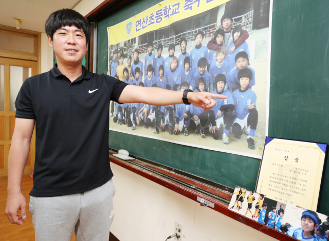 연산초 강민구 감독이 옛 축구부 사진에서 김현우를 가리키며 자랑스러워하고 있다. 강선배 기자 ksun@