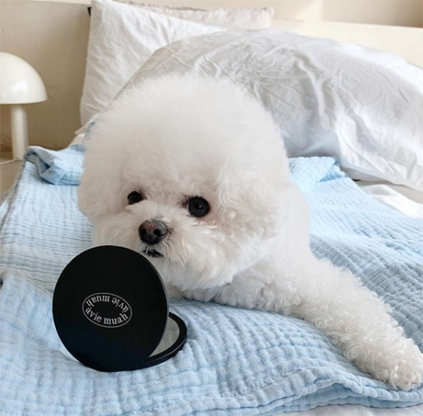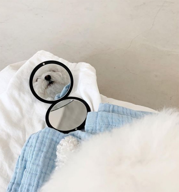 공개된 사진 속에는 강민경의 반려견 휴지가 침대에 누워 거울로 자신의 얼굴을 들여다보고 있다. 휴지는 자기가 봐도 귀여운지 거울을 빤히 쳐다보고 있어 웃음을 자아낸다.