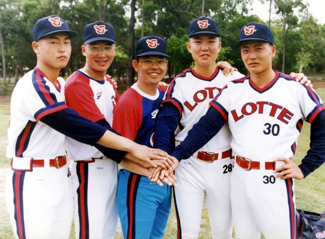 1994년 팀 창단 이래 처음 호주 골드코스트에서 전지훈련을 실시한 롯데 자이언츠 코치와 투수들이 잠시 모여 파이팅을 외치고 있다. 왼쪽부터 박경민, 김태형 선수, 양상문 코치, 주형광, 가득염 선수. 부산일보DB