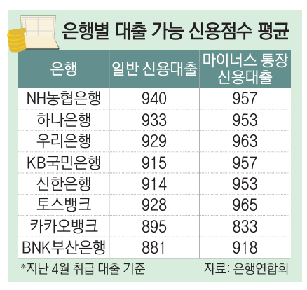 마이너스 통장의 벽은 더 높았다. 지난 4월 5대 시중은행의 마이너스 통장(신용 한도 대출) 개통 평균 신용점수는 956.6점으로 나타났다. 지난해 945.8점에서 1년 사이 8점가량이 올랐다.