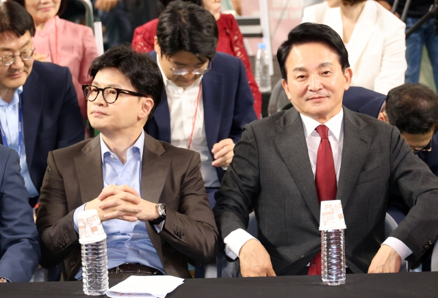 국민의힘 한동훈·원희룡 당 대표 후보들이 지난 15일 오후 충남 천안 유관순체육관에서 열린 대전·세종·충북·충남 합동연설회에 참석하고 있다. 연합뉴스