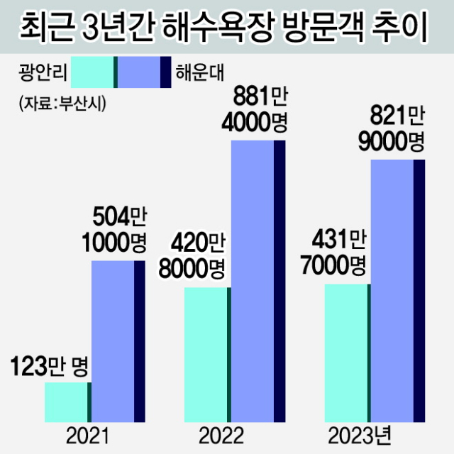 광안리해수욕장은 빠른 성장세를 보였다. 코로나19 시기였던 2021년 123만 명에 그친 광안리해수욕장 방문객 수는 2022년에 곧바로 420만 8000명까지 폭증했다. 지난해에도 431만 7000명이 찾으며 성장하는 모습을 보였다.