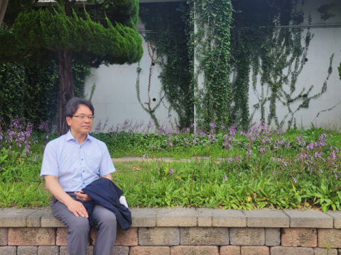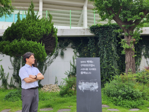 김요아킴 시인이 재개발 논란이 한창인 구덕운동장 앞에 앉아 생각에 잠겨 있다.