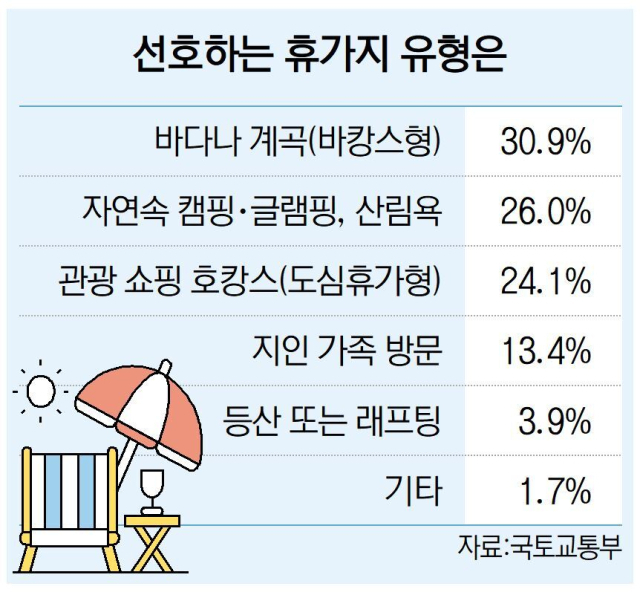선호하는 휴가 여행지 유형으로는 ‘바다·계곡(바캉스형)’이 30.9%로 가장 높게 나타났고 ‘사람이 없는 조용한 곳이나 삼림욕(자연동화형)’이 26.0%였다.