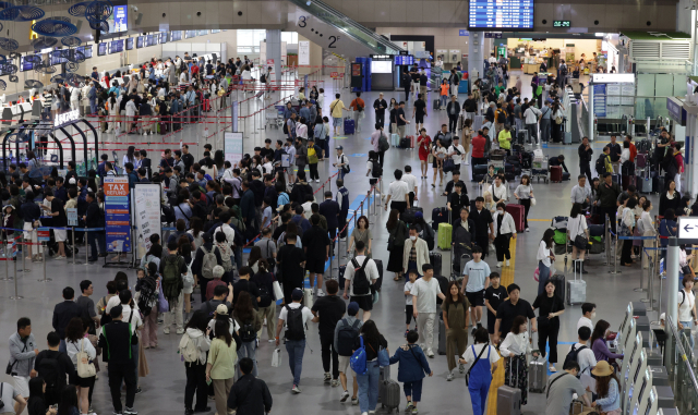 여행객으로 붐비는 김해국제공항 국제선 출국장의 모습. 부산일보DB
