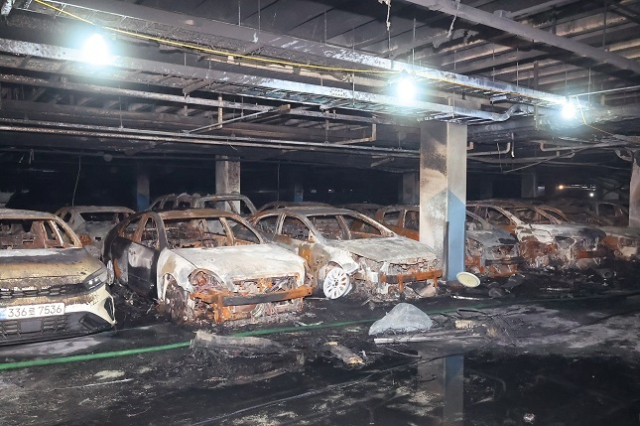 인천 서구 청라 아파트 지하 주차장에 전기차 화재로 인해 다른 차량들이 전소된 모습. 차량 40여대가 불에 탔고, 100여대가 열손 및 그을음 피해를 입었다. 연합뉴스
