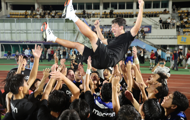 지난 2일 경남 고성군종합운동장에서 열린 제61회 청룡기 전국고교축구대회에서 우승을 차지한 경북 영덕고 선수들이 최호관 감독을 헹가래 치고 있다. 이재찬 기자 chan@