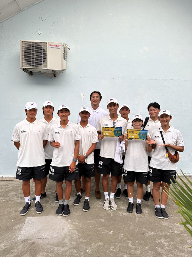 지난 24일(현지시간) 몰디브 로컬섬 툴루스두에서 열린 2024 아시아서핑챔피언십에 출전한 대한민국 서핑 남녀 국가대표팀 선수들. 송민 감독 제공