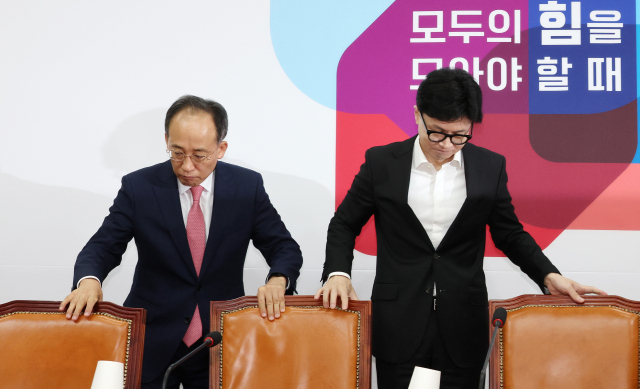 국민의힘 한동훈 대표와 추경호 원내대표가 30일 국회 최고위원회의에 입장하고 있다. 연합뉴스