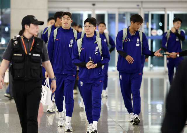 한국 축구 대표팀이 6일 오후 2026 북중미 월드컵 아시아 3차 예선이 열리는 요르단으로 출국하기 위해 인천국제공항 1터미널 출국장으로 들어서고 있다. 연합뉴스