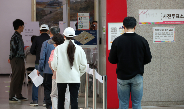 10·16 재보궐선거 사전투표 첫날인 11일 오전 부산 금정구청에 마련된 투표소에서 유권자들이 줄을 서 있다. 연합뉴스