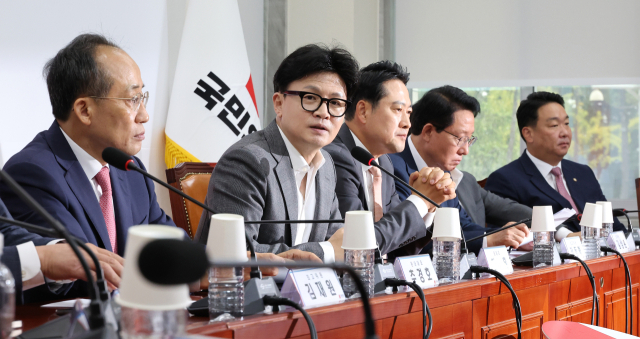 국민의힘 한동훈 대표(왼쪽 두번째)가 14일 오전 국회에서 열린 최고위원회의에서 발언하고 있다. 연합뉴스