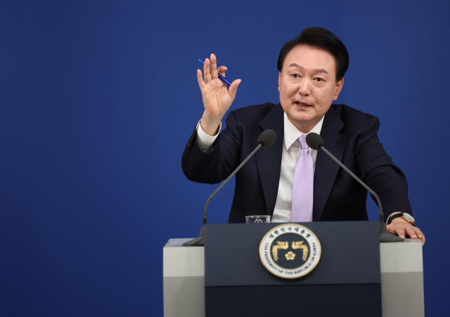 윤석열 대통령은 8일 공개된 미국 시사주간지 뉴스위크와의 인터뷰에서 “북한 김정은이 한국에 대한 핵 공격 감행을 결정한다면 매우 비이성적 행동”이라고 말했다. 사진은 윤 대통령이 지난 7일 오전 서울 용산 대통령실 청사 브리핑실에서 열린 대국민담화 및 기자회견에서 질문에 답변하는 모습. 연합뉴스