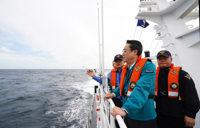 강도형(오른쪽) 해양수산부 장관이 지난 8일 오후 제주 비양도 북서방 약 12해리 해상에서 침몰한 대형선망 ‘135금성호’의 신속한 구조를 위한 상황점검회의를 제주 현지에서 주재하고 현장 수색상황을 점검했다. 해수부 제공