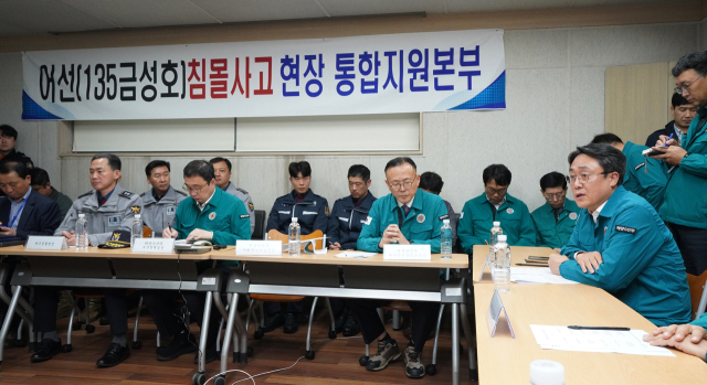 강도형 해양수산부 장관이 지난 8일 오후 제주 비양도 북서방 약 12해리 해상에서 침몰한 대형선망 ‘135금성호’의 신속한 구조를 위한 상황점검회의를 제주 현지에서 주재하고 현장 수색상황을 점검했다. 해수부 제공