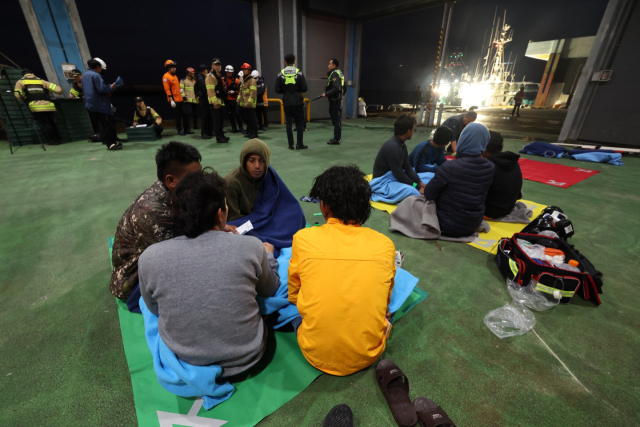 지난 8일 제주 해상에서 발생한 부산 선적 금성호 침몰 사고 현장에서 구조된 선원들이 이날 제주시 한림항에서 병원 이송을 기다리고 있다. 연합뉴스