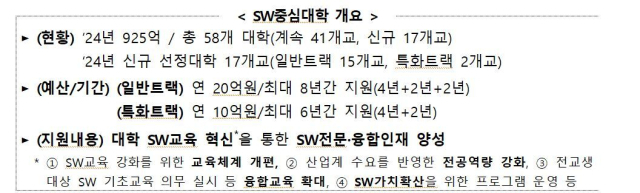 2015년 출범한 SW중심대학 사업은 SW를 중심으로 대학 교육체계를 혁신하고, 산업수요 기반 양질의 AI(인공지능)·SW 신기술 교육을 통해 그동안 4만 8969명의 SW 전문인력과 3만 4257명의 SW 융합인력을 배출했다. 2015년 8개교를 처음 선정한 이래, 현재 58개 대학을 지원하고 있으며, 전교생 대상 SW기초교육, 초·중·고 학생과 교원을 위한 SW 캠프 운영 등 SW교육의 저변을 확대하고 SW의 사회적 가치확산에 기여해 왔다.