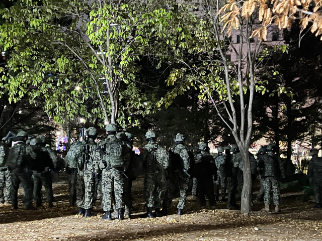 윤석열 대통령이 비상계엄을 선포한 가운데 4일 새벽 서울 여의도 국회의사당에 무장한 계엄군이 경내에 대기하고 있다. 연합뉴스
