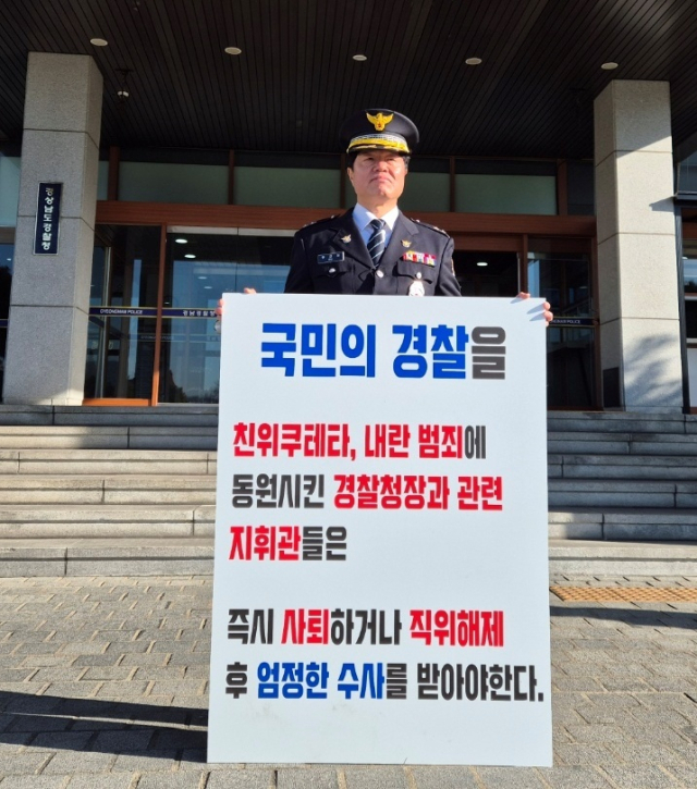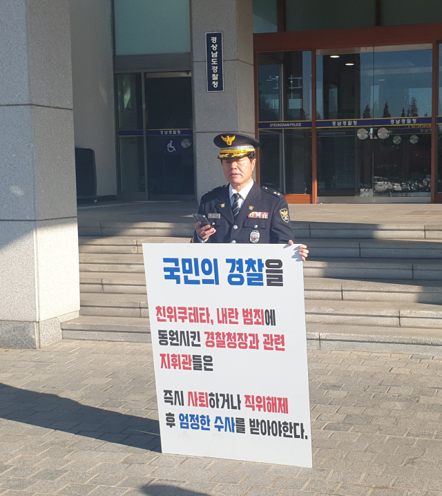 마산동부경찰서 류근창 경비안보계장(경감)은 9일 경남청 현관 앞에서 조지호 경찰청장의 사퇴·직위해제를 요구하는 1인 시위를 벌이고 있다. 강대한 기자