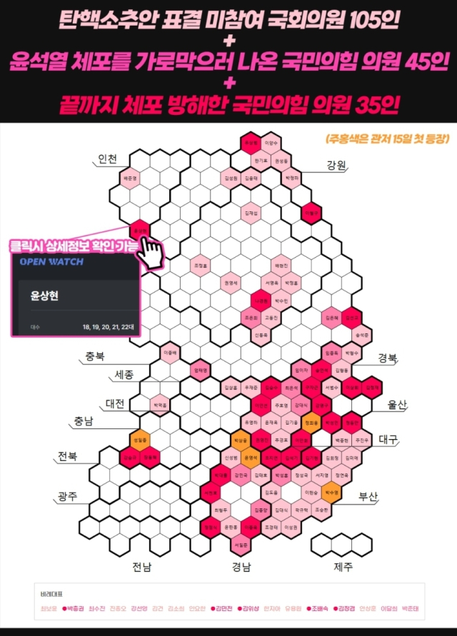 한편, 시민단체 '투명사회를 위한 정보공개센터'는 윤 대통령 체포와 탄핵에 반대한 국민의힘 의원들의 지역구를 나타낸 지도를 제작, 공개하기도 했다. 이들은 "윤 대통령 체포를 막고 탄핵에 반대한 국민의힘 의원 프로필을 공개한다"며 전국 지도에 색깔별로 해당 의원 지역구를 표시했다. 연한 분홍색과 진한 분홍색, 빨간색과 주황색으로 △윤 대통령 탄핵소추안 표결에 불참한 의원(연한 분홍색) △1월 6일 윤 대통령 관저에 모인 의원(진한 분홍색) △1월 15일 윤 대통령 관저에 모인 의원(빨간색) △1월 15일 관저에 처음 방문한 의원(주황색) 등으로 구분했다. 이들은 "탄핵소추안 표결에 참여하지 않은 105명의 국민의힘 국회의원, 윤석열 체포를 막아선 45명의 국민의힘 국회의원, 체포영장 집행일까지 방해한 35명의 국민의힘 국회의원들을 기억하겠다"며 지도 제작 배경을 밝혔다.