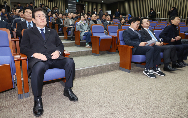 더불어민주당 이재명 대표와 의원들이 15일 국회에서 열린 의원총회에 입장해 윤석열 대통령을 태운 차량이 고위공직자범죄수사처로 향하는 뉴스를 바라보고 있다. 연합뉴스