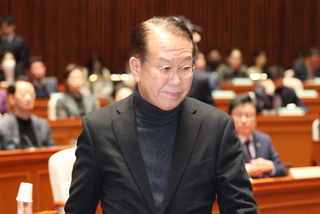 국민의힘 권영세 비상대책위원장이 15일 서울 여의도 국회에서 열린 비상 의원총회에서 발언대로 향하고 있다. 연합뉴스