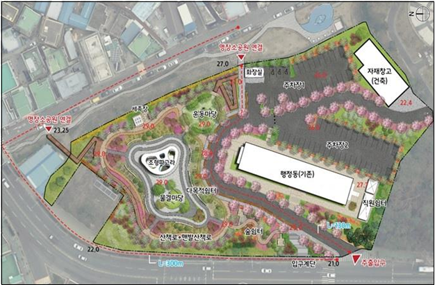 이번에 공원으로 개방되는 부지는 정수장 내 동래통합사업소 부지 중 행정동(1034㎡) 면적을 제외한 1만 1639㎡이다. 3600여 평 규모다. 현재 부지 위에 설치된 정수장 자재창고를 주차장 인근으로 옮기고 △맨발 산책로 △숲 쉼터 △물결마당 △조형파고라 △다목적 쉼터 △운동 마당 등이 들어선다.