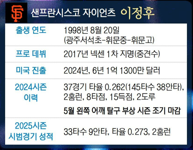 이정후는 시범경기에서 33타수 9안타, 타율 0.273, 2홈런을 기록했다. 그는 시범경기 일정 중반까지 맹활약하다 뜻하지 않은 ‘수면 중 부상’을 당하는 우여곡절을 겪었다. 열흘간 쉬고 24일 마이너리그 팀과 연습경기에 다시 출장해 2루타를 터뜨려 올해 팀이 가장 기대하는 선수라는 평가를 만족시켰다. 올해는 3번타자 중견수로 활약할 것으로 보인다.