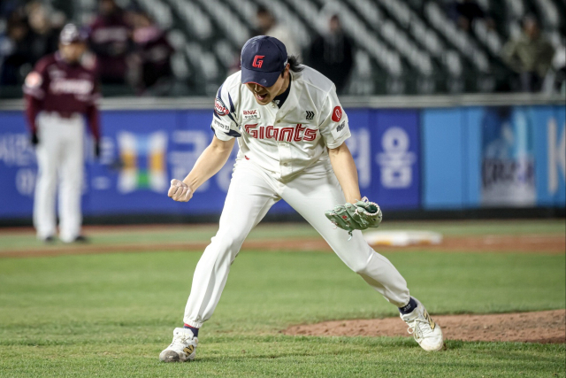 롯데 자이언츠 불펜의 ‘마당쇠’ 정철원이 15일 부산 사직구장에서 열린 2025 KBO리그 키움 히어로즈와의 7회초 경기에 나서 실점 없이 마무리한 뒤 포효하고 있다. 롯데 자이언츠 제공