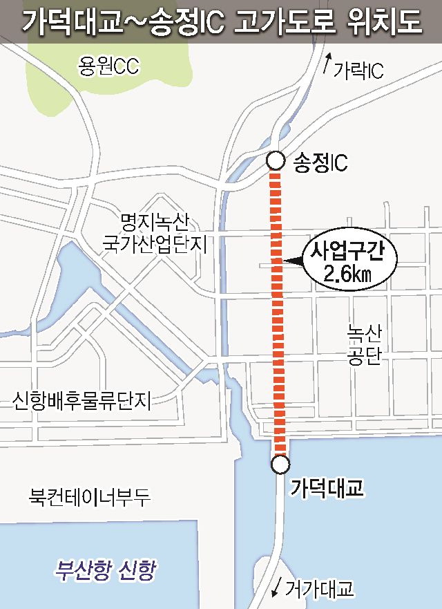 이 사업 핵심은 녹산산단 위에 2.62km 왕복 4차로 고가도로를 만드는 것이다. 녹산산단 내부 도로의 만성적인 정체를 해결하기 위해서다. 가덕대교 종점에서 고가도로를 타면 녹산산업대로를 통과하지 않고 곧바로 송정IC까지 접근할 수 있다.