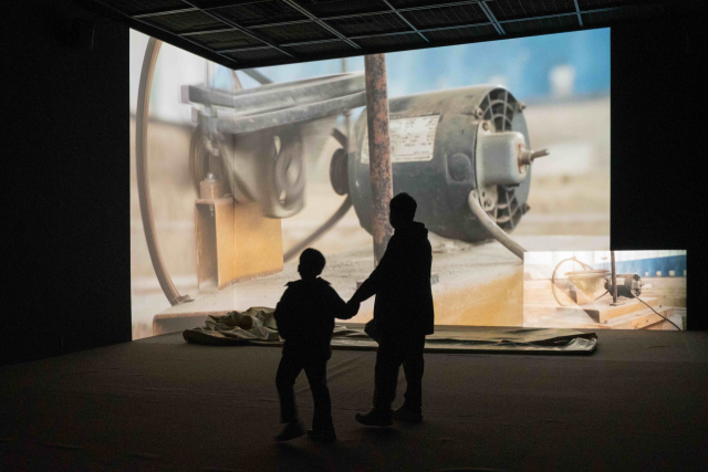 하이너 괴벨스의 '물고기는 땅 위에서 걷는 법을 배워야 할 것이다'(The Fish Will Have to Learn to Walk on Land) 영상 설치 공간 모습. 부산현대미술관 제공