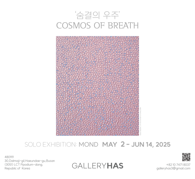 몬트(MOND) 작가 개인전. 이번 전시는 작가가 2021년부터 본격적으로 탐구해 온 ‘페인트 블로잉’(Paint-blowing) 기법을 중심으로 구성되며, 호흡이라는 비가시적 에너지를 통해 시공간의 무한한 가능성과 존재의 본질을 그려낸 작품을 선보인다. ‘몬트’(MOND)는 독일어로 ‘달’을 의미하며, 작가는 달의 보이지 않는 이면처럼 우리 안의 ‘보이지 않는 가능성’을 끊임없이 상상하고 시각화해 왔다. 몬트는 작가 노트에서 “한 점 한 점 불어서 일렁이며 퍼져나가는 파동은 자유롭고 무작위적이며 무한한 가능성을 지닌 우주의 결정체”라며 “직접적인 도구의 터치 없이 파동이 표현되는 것은 우주를 그리는 것과 같다”고 밝혔다. ▶5월 2일(금)~6월 14일(토) 부산 해운대구 갤러리하스(달맞이길 30 포디움동 3051). 관람 시간 화~토요일 오전 10시~오후 6시. 일·월요일 휴관.
