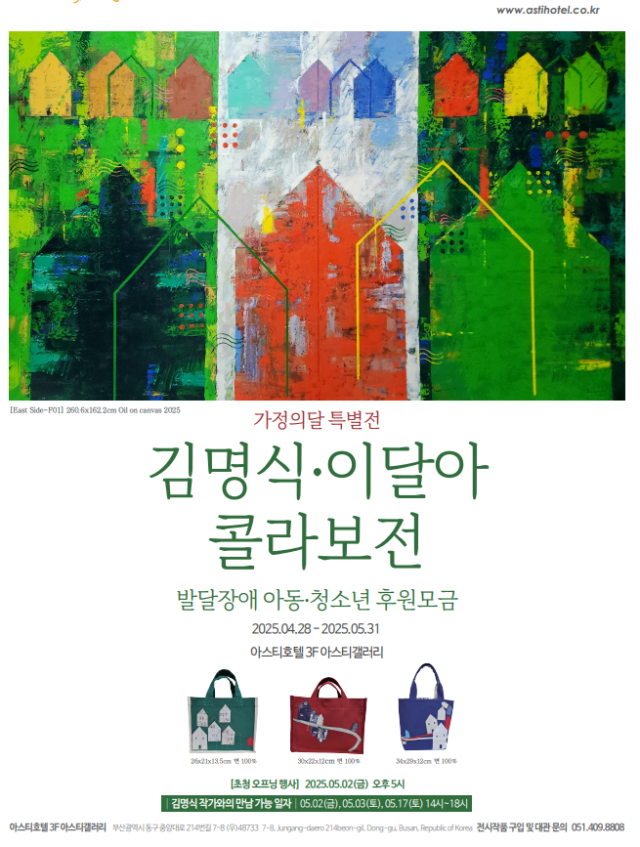 집을 의인화하는 작품으로 알려진 김명식 작가의 ‘이스트 사이드 스토리’(East Side Story) 시리즈와 이달아 작가의 협업 작품인 ‘아트백’으로 다양한 작품을 선보인다. ▶4월 28일(월)~5월 31일(토) 부산 동구 아스티갤러리(아스티호텔 3층).