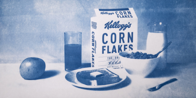 안종우, Still life with Corn flakes, 장지에 시아노타입 Cyanotype on Korean pape, 60x120x4cm, 2025. 갤러리 플레이리스트 제공