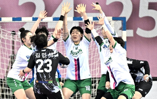 부산시설공단 선수들이 지난 21일 핸드볼 H리그 플레이오프에서 삼척시청의 공격을 막고 있다. 한국핸드볼연맹 제공