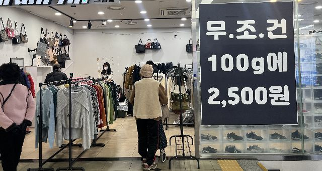 불황에 중고 물품이 인기를 끌면서 부산도시철도 서면역 지하상가에 있는 한 빈티지 의류 판매점에서 무게 100g당 2500원에 중고 의류가 팔리고 있다. 부산일보DB