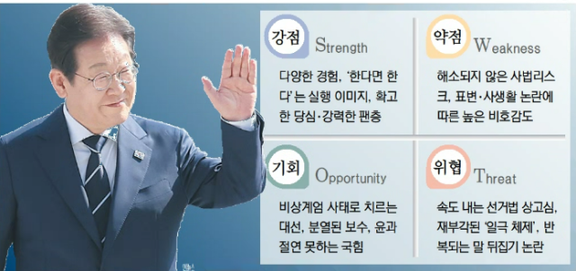 더불어민주당 이재명 후보가 27일 최종 수도권 순회 경선에서도 압도적 승리를 거두면서 당 대선후보로 확정됐다. 3년 전 대선에 이어 재차 민주당 후보로서 대권 재도전에 나선 것이다. 이 후보는 ‘12·3 비상계엄’으로 조기 대선 가능성이 부상한 이후 여야 대권주자 중 압도적 1위를 줄곧 지켜오면서 ‘어대명’(어차피 대통령은 이재명)이라는 조어를 만들어냈지만, 40일도 채 남지 않은 이 후보의 대권가도는 말처럼 순탄해 보이진 않는다. 40% 초반의 지지율 벽을 쉽게 넘어서지 못하는 비호감의 벽, 그리고 사법리스크가 여전한 지뢰로 남아있다. 이 후보의 강점(Strength)과 약점(Weakness), 기회(Opportunity)와 위협(Threat) 요인을 들여다보는 ‘SWOT’ 분석으로 이 후보의 확장성을 점검한다.