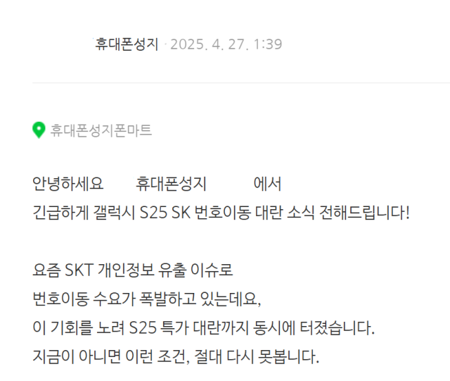 한편 지난 주말 이동통신 시장에서는 SK텔레콤이 ‘번호이동’ 보조금을 일시적으로 상향하는 ‘보조금 대란’이 발생했다는 주장이 나왔다. ‘보조금 성지’로 불리는 일부 온오프라인 매장에서는 “갤럭시 S25 SK 번호이동 대란 소식을 전한다”면서 “SK텔레콤 개인정보 유출 이슈로 번호이동 수요가 폭발하고 있는데 이 기회를 노려 S25 특가 대란이 터졌다”고 공지했다.