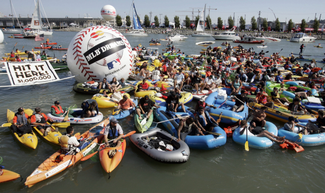 오라클 파크 담장 넘어 날아가는 ‘스플래시 히트’를 잡기 위해 늘어선 보트와 요트들. AP·UPI연합뉴스