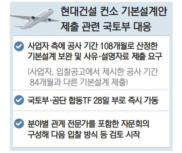 국토부는 “현대건설 측이 제출한 기본설계 중 공사 기간과 관련한 내용이 입찰공고에 맞지 않아 관련 법령에 따라 현대건설에 기본설계를 보완할 것과 공사 기간을 다르게 제시한 구체적 사유 및 설명 자료 제출을 요구했다”고 밝혔다.