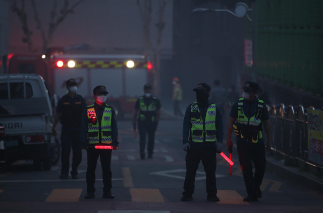 대구에서 발생한 대형 산불이 이틀 만에 진화됐다가 일부에서 재발화하며 확산하는 가운데 30일 오후 대구 북구 서변동 일대 주택가가 산불에 의한 연기에 휩싸이며 경찰이 출입을 통제하고 있다. 연합뉴스